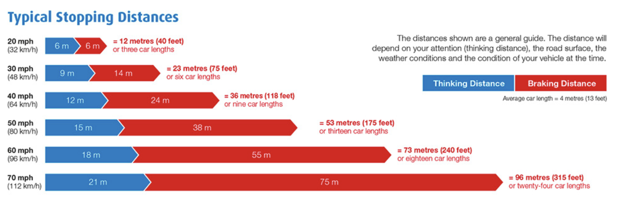 Remember: these measurements will be at least doubled when driving in the rain.