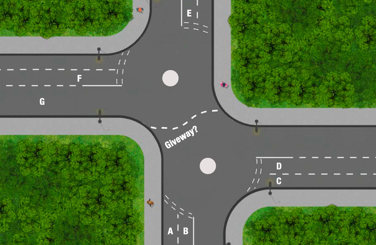 Going ahead at a double roundabout: Imagine you are in Pos A on the diagram above. Your danger at the first roundabout would come from Pos D, as Pos C is turning left. As you approach the 2nd mini roundabout, you will need to potentially give way at the lines which say ‘Giveway?’ Your danger at the 2nd roundabout would come from Pos E. If you notice Pos E slowing down then they could be giving way to their right, which would be Pos F.